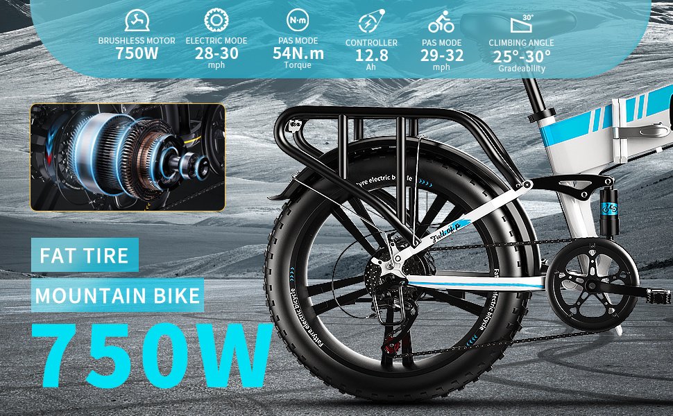 1.STRONG 750W MOTOR:This electric bike for adults is equipped with a 750W high-speed brushless motor, it delivers a powerful driving force in acceleration and climbing hills with the max speed of 30mph, producing 54Nm of torque,which can tackle the most extreme terrain, including beach, mountain and