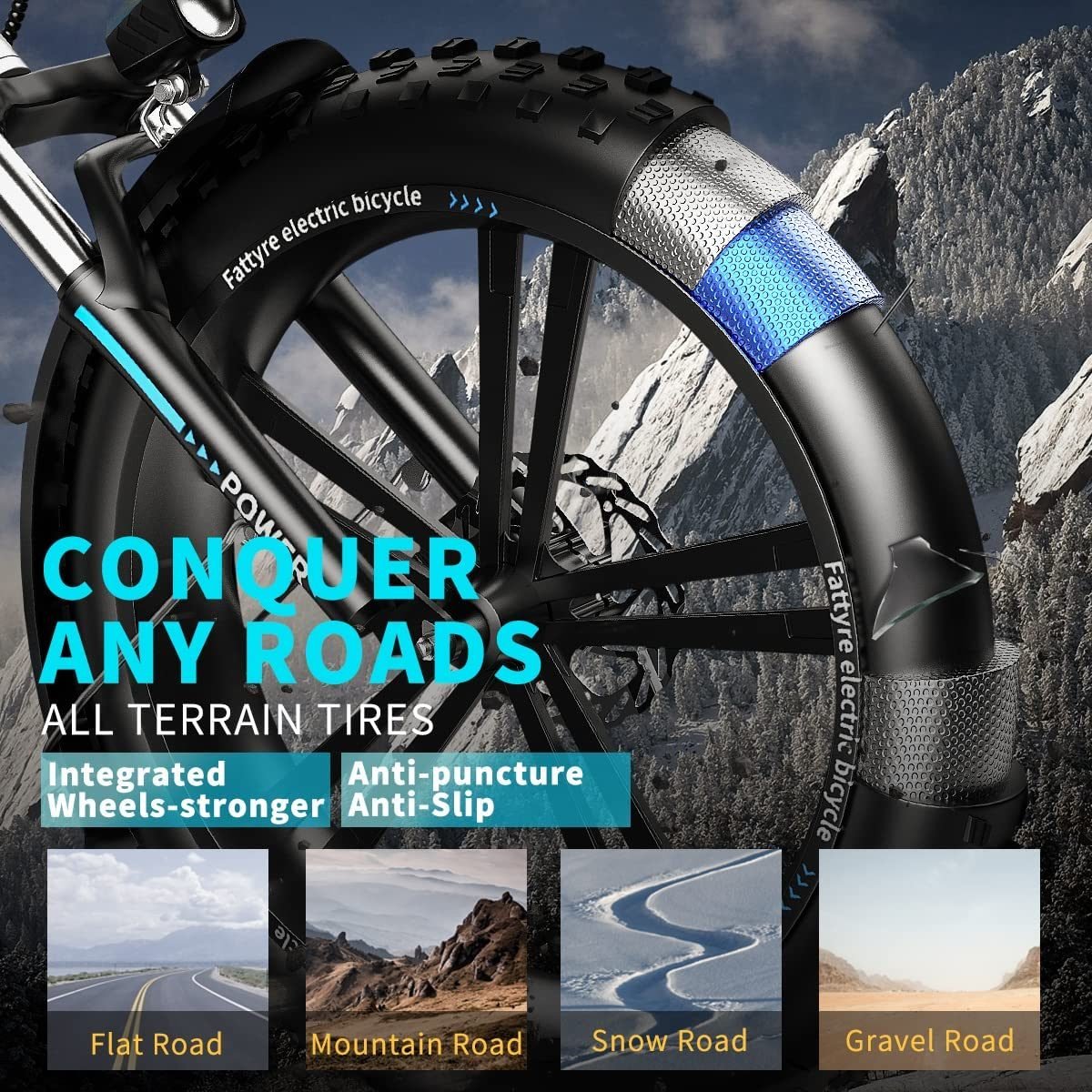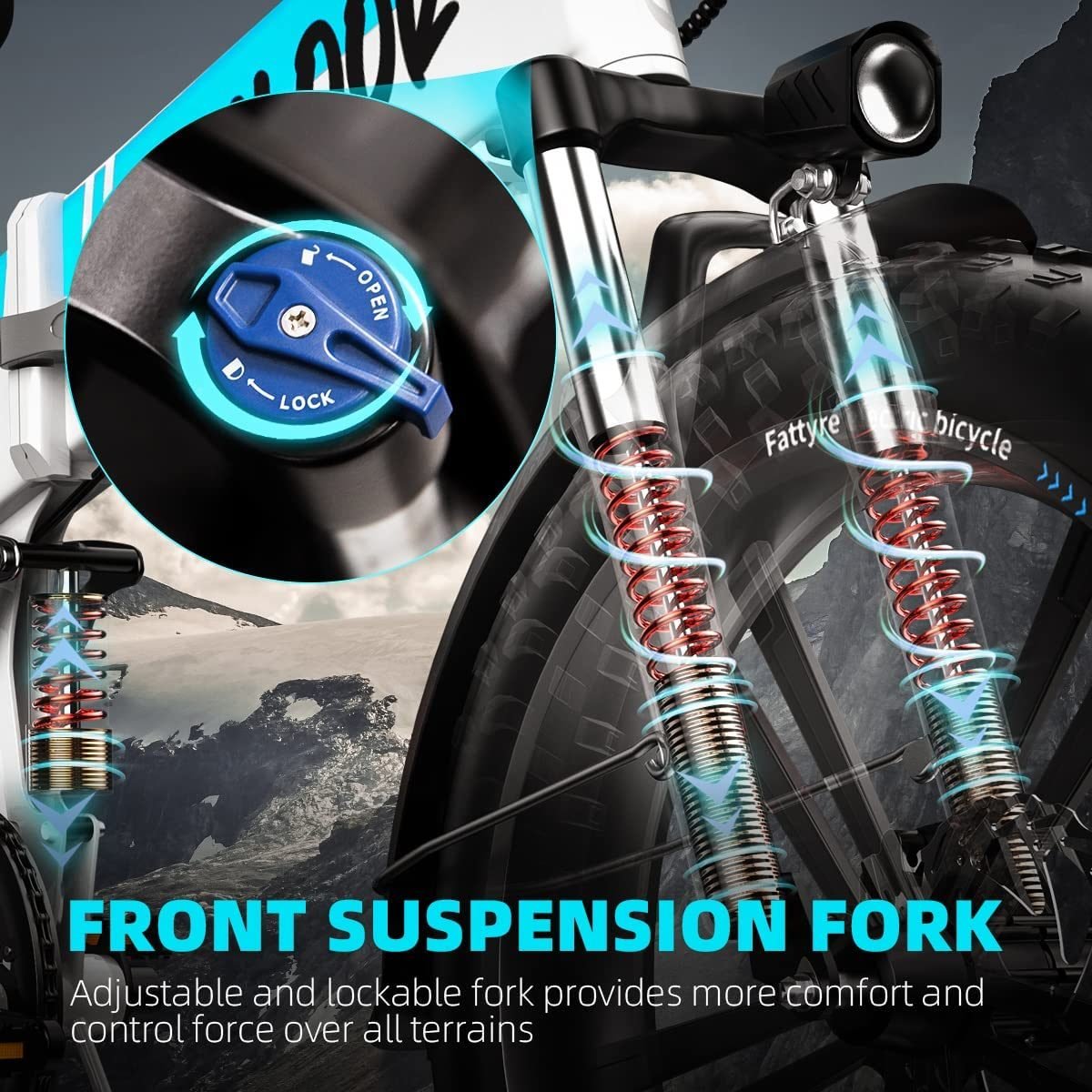 3.COMFORTABLE DUAL SUSPENSION:The e bikes for adults electric equips with an all-terrain front suspension fork and 760-pound adjustable shock absorber. Longer service life, better shock absorption. 20*4.0 inches fat tires help to provide a smoother and more comfortable riding experience to adjust all