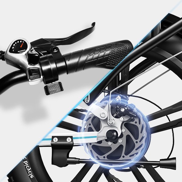 4.BRAKE & SHIMANO GEAR SYSTEM:Ebikes for adults 7 Speed gear increases hill-climbing power, further range variation, and greater terrain adaptability. According different road conditions, reduce the strength and pressure of your legs effectively. Together with the front and rear mechanical disc brake