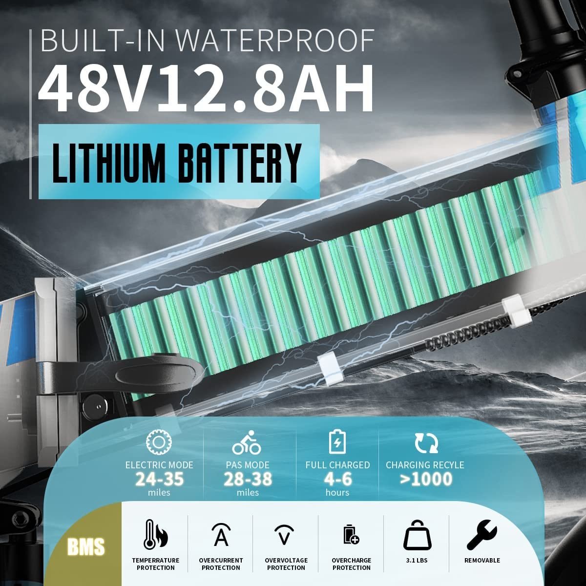 2.WATERPROOF 48V 12.8Ah LG LITHIUM BATTERY:With the upgraded 48V 12.8Ah LG waterproof battery,which is perfectly hidden in the frame to ensure the safety of the electrical system during fierce riding, also can provide ride range 24-35miles in electric mode, 35-48miles in PAS mode, combining the two m
