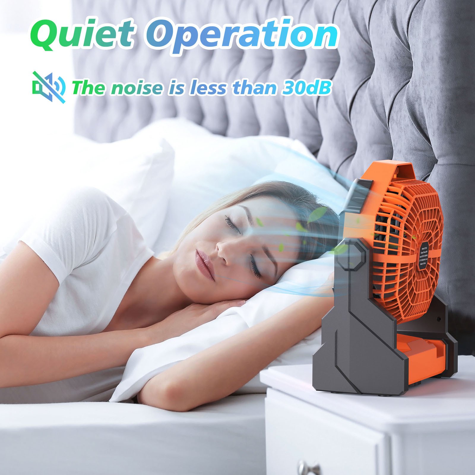 1.Long-Lasting Battery: This rechargeable camping fan is built with a 10400mAh rechargeable battery that can work continuously for 13-43 hours. It also supports working while charging, and does not generate heat during use, making it safe for children.
